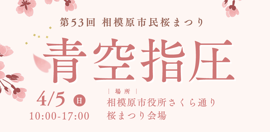 桜の下で、心と体を解き放つ。相模原市民桜まつり「青空指圧」開催のお知らせ 指圧の根底には、「指圧の心 母ごころ、押せば生命の泉わく」という、他者を慈しむ無償の愛の精神が存在します。 肩書きや治療院の壁を取り払い、青空の下でただ目の前で疲労や... -